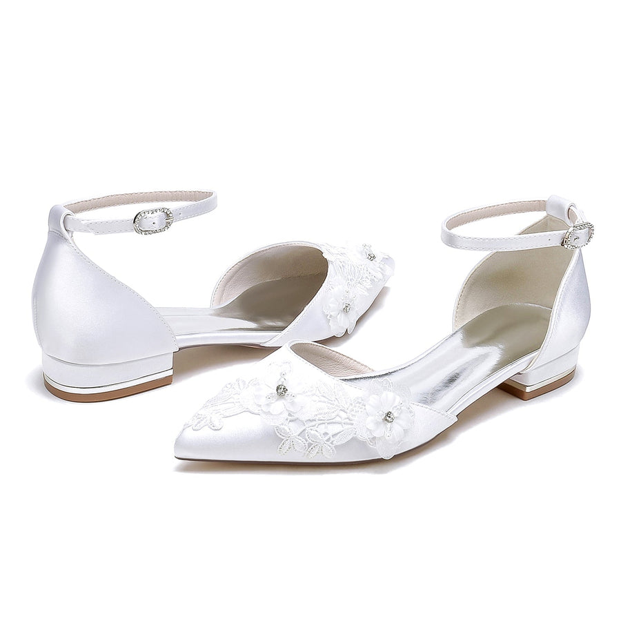 Damen Seidensatin mit Knöchelriemen Blume Geschlossene Zehen Flacher Absatz Hochzeitsschuhe